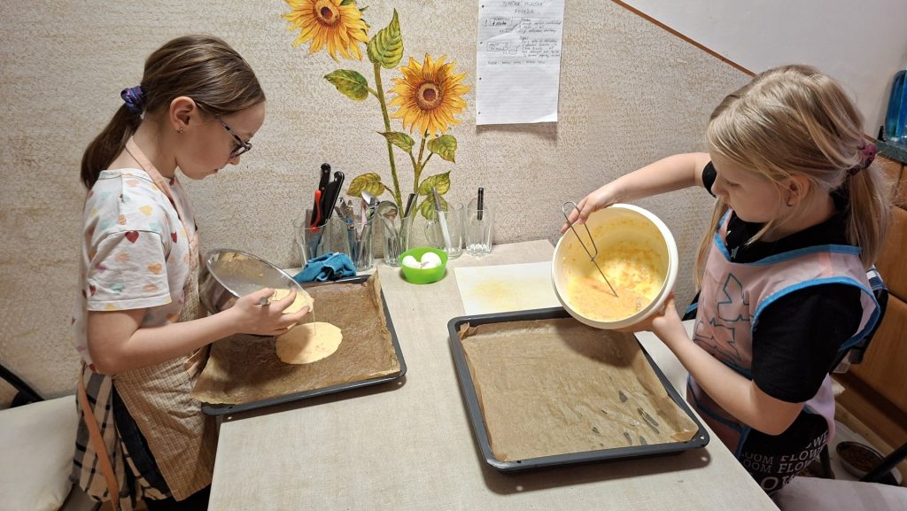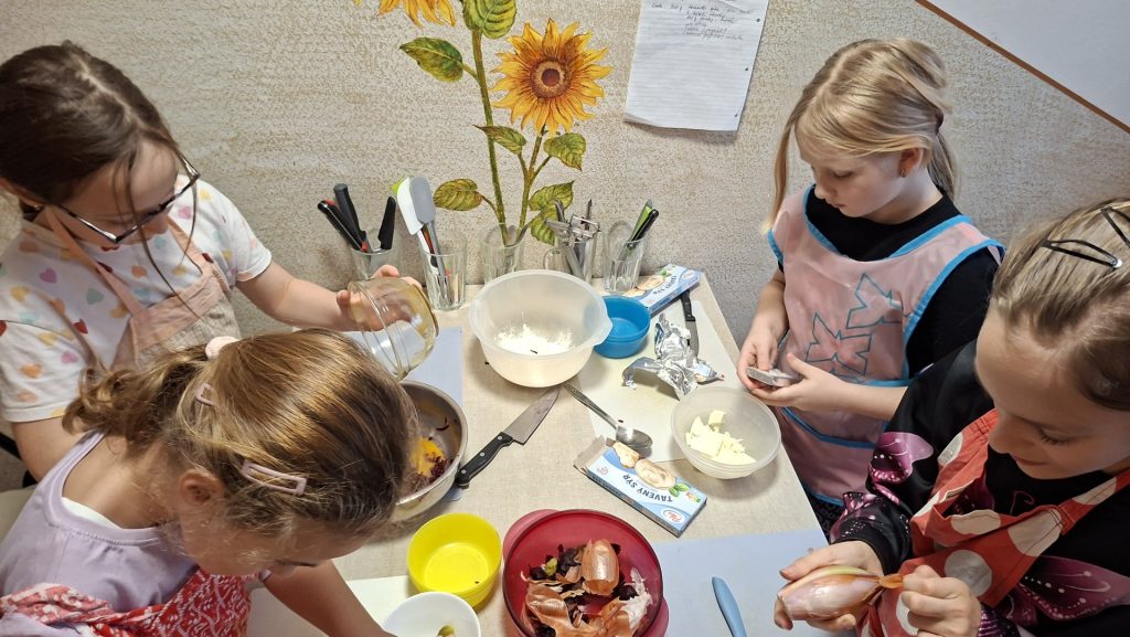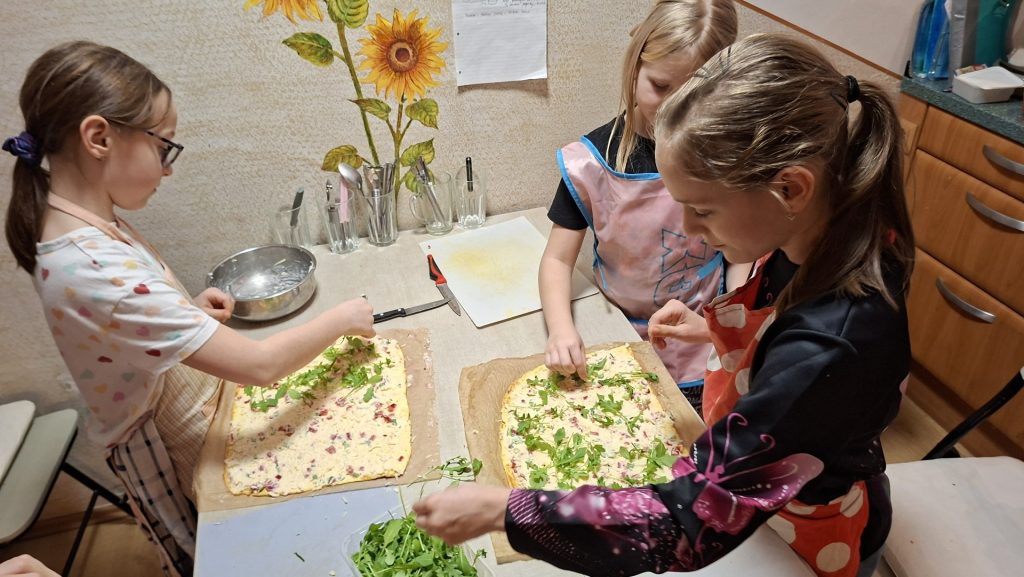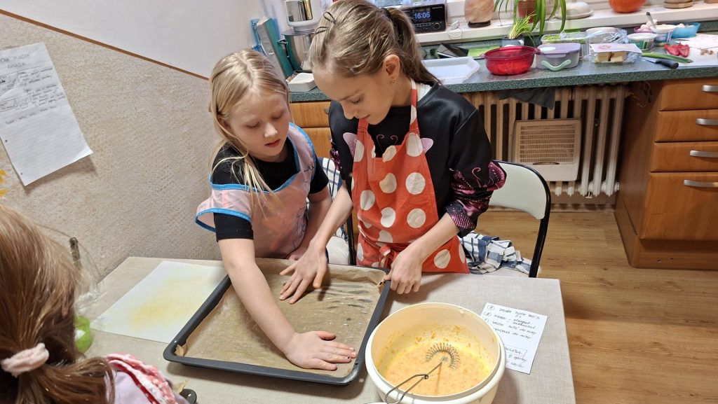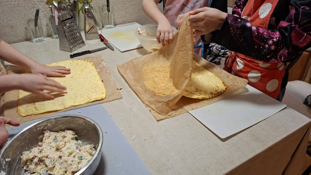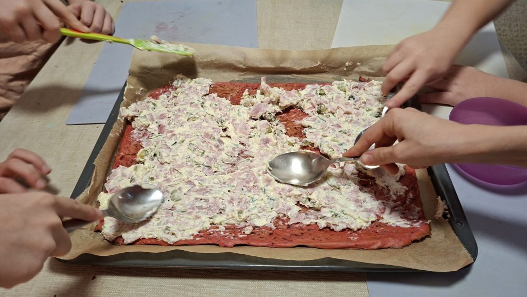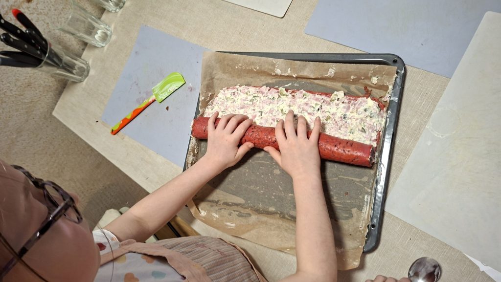 Jako první přišla na řadu roláda z červené řepy. Dvě bulvy už byly uvařené, vejce v ošatce, mouka na stole. Začali jsme práci hromadně, ale každý měl za úkol přispět svou činností ku zdárnému výsledku. Nejodvážnější kuchařka si vzala na starost řepu a chráněna rukavicemi ji oloupala a nastrouhala na struhadle nahrubo. Další adeptka si vzala pod křídla vejce, což měla náročnější v tom, že musela nejen oddělit žloutky od bílků, ale ještě vyšlehat sníh. Další si vzala na starosti vážení ostatních surovin, jako byla hladká mouka, olej a sůl a ta poslední v řadě připravila plechy s pečícím papírem. Trouba už se hlásila ke slovu, takže jsme jí věnovali rozlitou směs do jejího opatrování a jali se připravit náplň do rolády. Ta se skládala ze slušné dávky taveného sýra, notné porce krájené šunky a kostiček kyselé okurky. Tuhnutí placky netrvalo dlouho a my jsme mohli po jejím částečném vychladnutí přistoupit k dalšímu kroku. Nejprve jsme roládu obrátily naruby a snažili se rovnoměrně rozetřít na té spodní části náplň. Šlo to, ale o souvislé vrstvě se mluvit nedalo. Nakonec jsme po delší straně roládu zarolovali, zabalili do pečícího papíru a nechali ztuhnout v lednici.