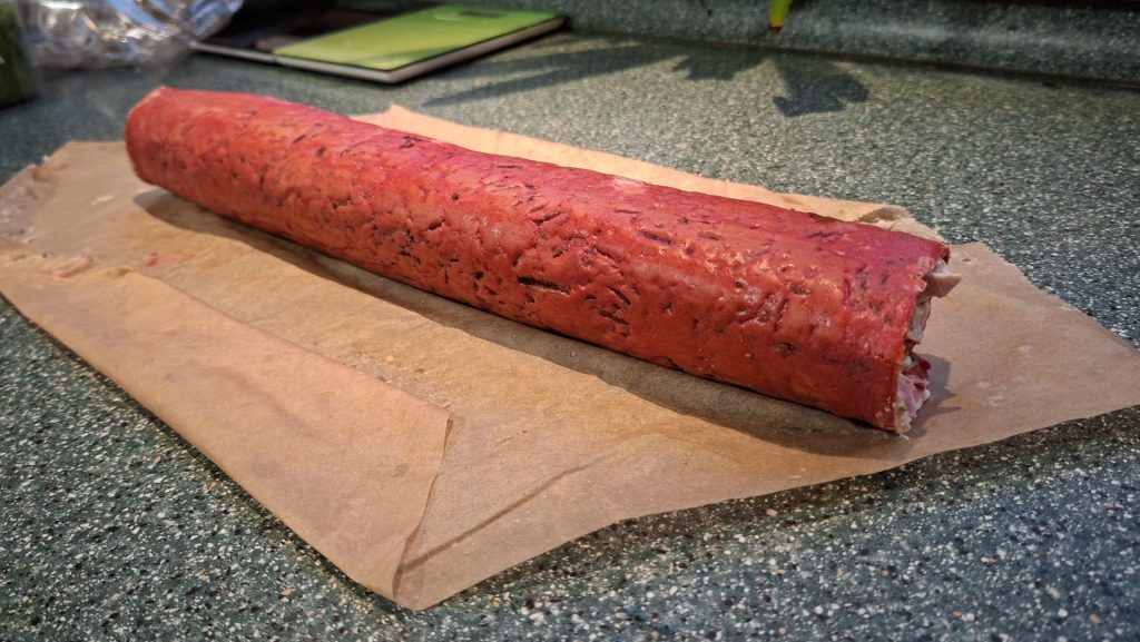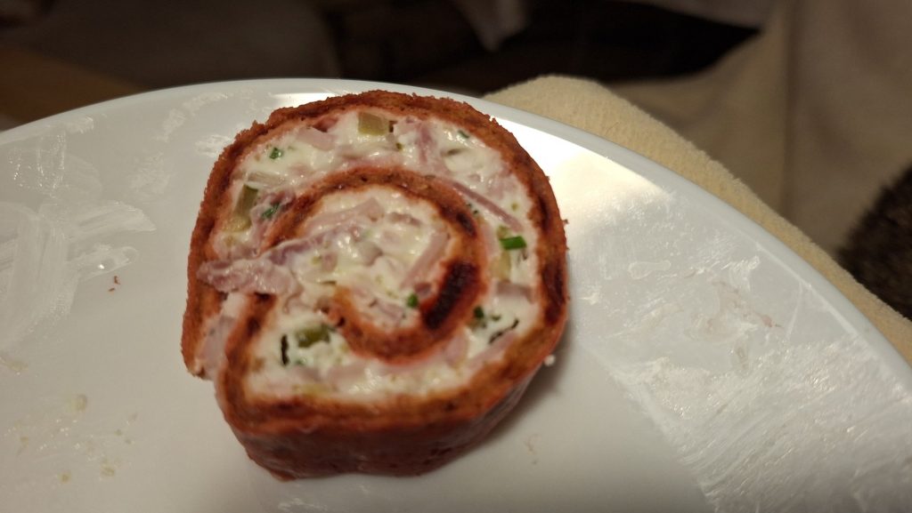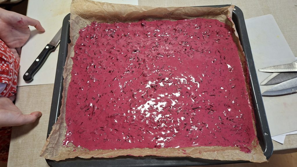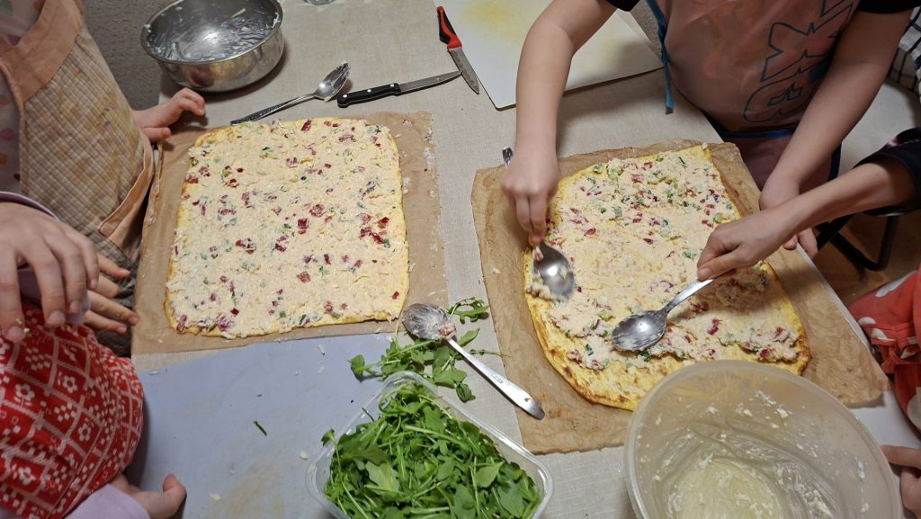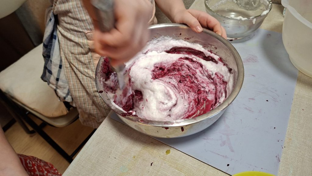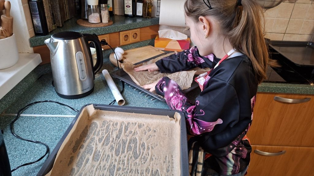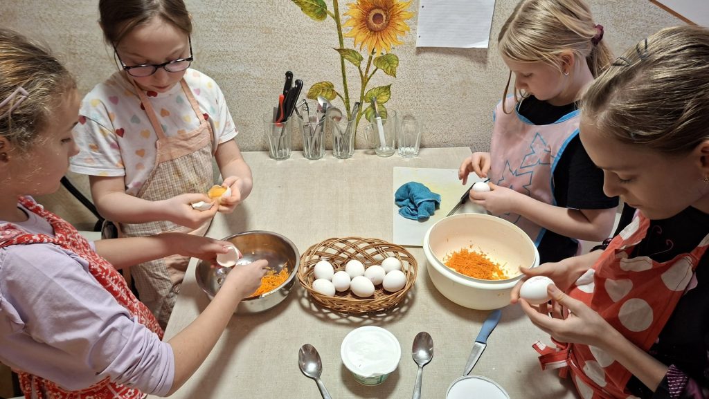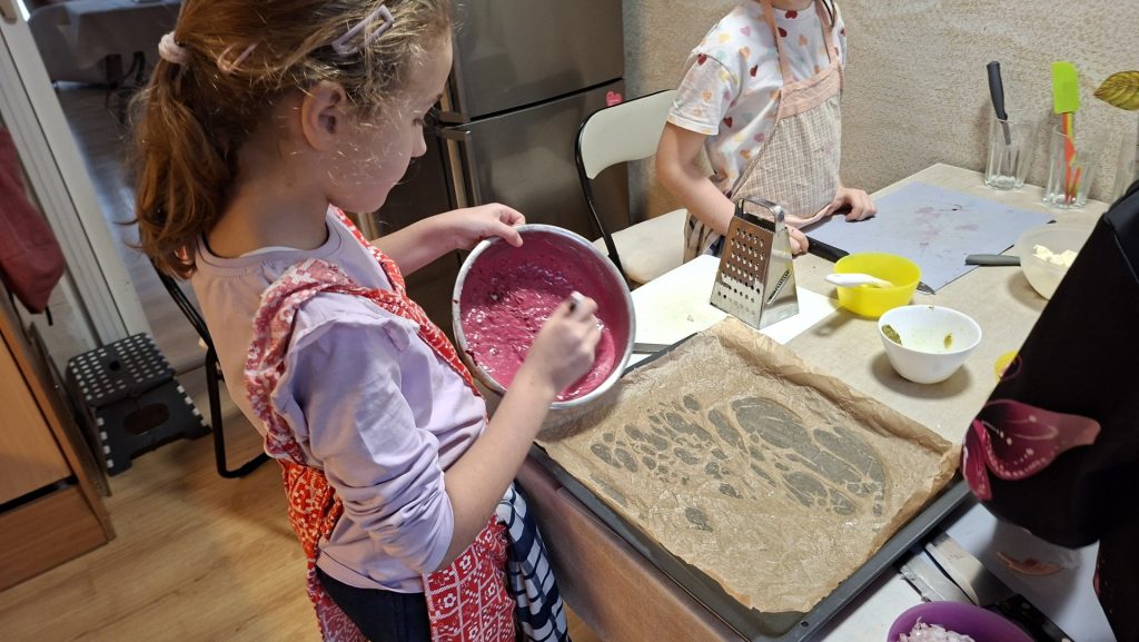 Jako první přišla na řadu roláda z červené řepy. Dvě bulvy už byly uvařené, vejce v ošatce, mouka na stole. Začali jsme práci hromadně, ale každý měl za úkol přispět svou činností ku zdárnému výsledku. Nejodvážnější kuchařka si vzala na starost řepu a chráněna rukavicemi ji oloupala a nastrouhala na struhadle nahrubo. Další adeptka si vzala pod křídla vejce, což měla náročnější v tom, že musela nejen oddělit žloutky od bílků, ale ještě vyšlehat sníh. Další si vzala na starosti vážení ostatních surovin, jako byla hladká mouka, olej a sůl a ta poslední v řadě připravila plechy s pečícím papírem. Trouba už se hlásila ke slovu, takže jsme jí věnovali rozlitou směs do jejího opatrování a jali se připravit náplň do rolády. Ta se skládala ze slušné dávky taveného sýra, notné porce krájené šunky a kostiček kyselé okurky. Tuhnutí placky netrvalo dlouho a my jsme mohli po jejím částečném vychladnutí přistoupit k dalšímu kroku. Nejprve jsme roládu obrátily naruby a snažili se rovnoměrně rozetřít na té spodní části náplň. Šlo to, ale o souvislé vrstvě se mluvit nedalo. Nakonec jsme po delší straně roládu zarolovali, zabalili do pečícího papíru a nechali ztuhnout v lednici.