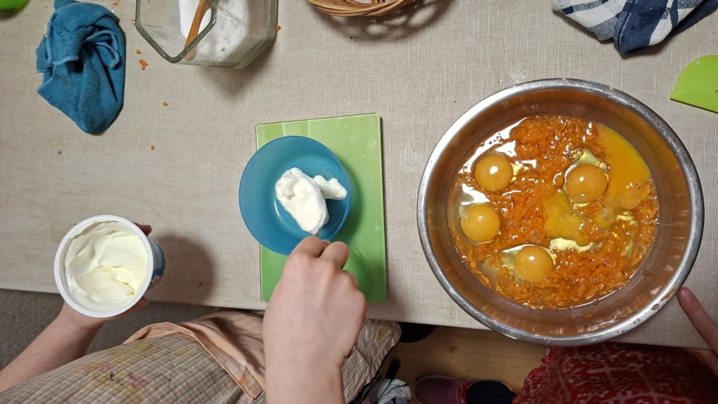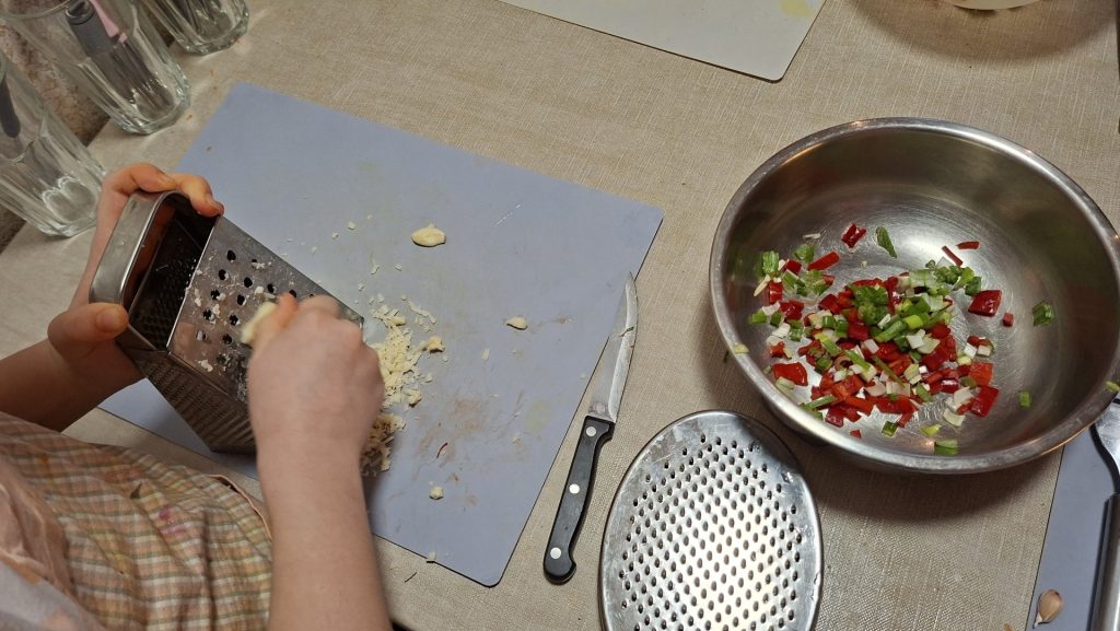 Na řadu přišla roláda druhá, ovšem tu si udělala každá dívka sama, tedy jednu šišku ve dvojici. Tady už se začaly zúročovat kroky, které jsme uskutečnily před hodinou. Opět se rozklepávala vejce, tentokrát ale zůstala celá, jedna roláda pojala 6 vajec, 2 jemně nastrouhané mrkve a část zakysané smetany. To vše opět skončilo jako rozlitá směs na plechu, my měly dva. Chvíle, kdy směs tuhla, se dívky ponořily znovu do tvorby náplně. Oproti její předchůdkyni byla z pomazánkového másla, česneku, pažitky, jarní cibulky a červené papriky. Po jejím nanesení jsme ji mohly ještě posypat rukolou a zarolovat. Výsledek byl přímo vzorový, ale k jídlu už nedošlo. Vlastně ano, možná někde po cestě domů, ale mě nic moc nezbylo, nicméně den poté jsem si vyzkoušela další recept s cuketou, tím pádem jsem o nic nepřišla.