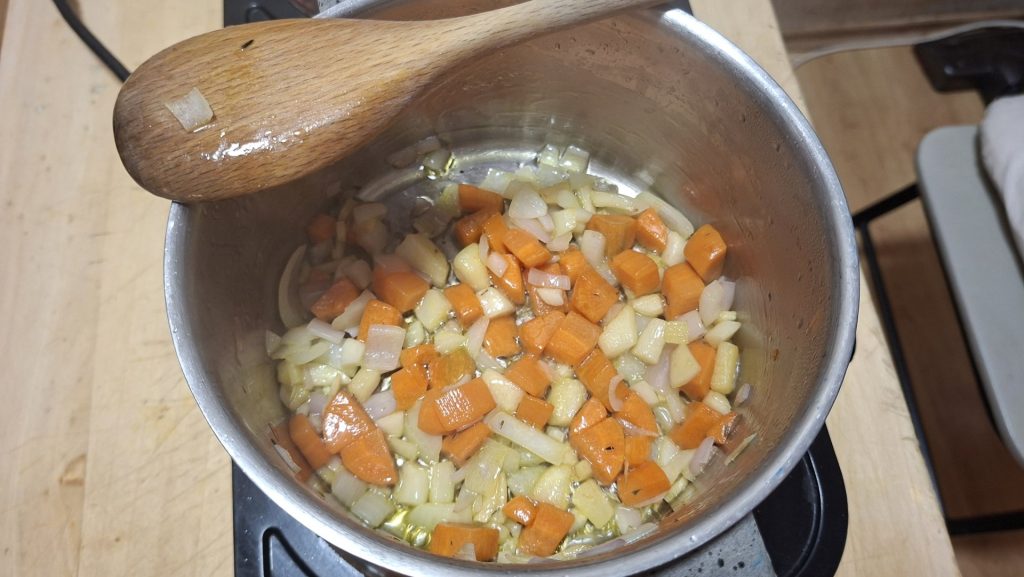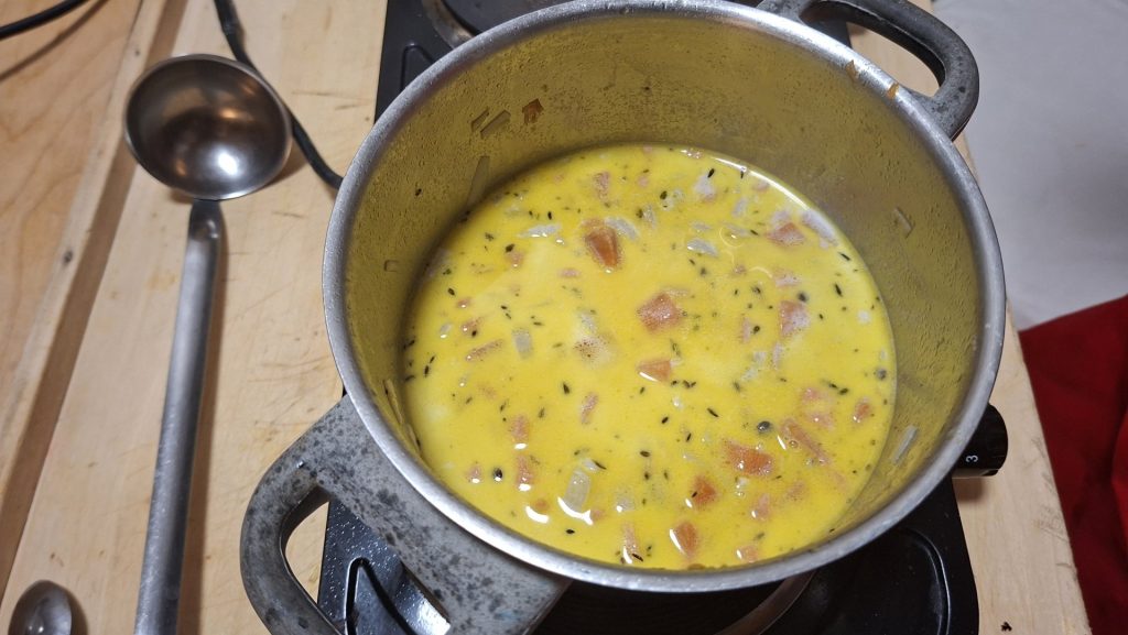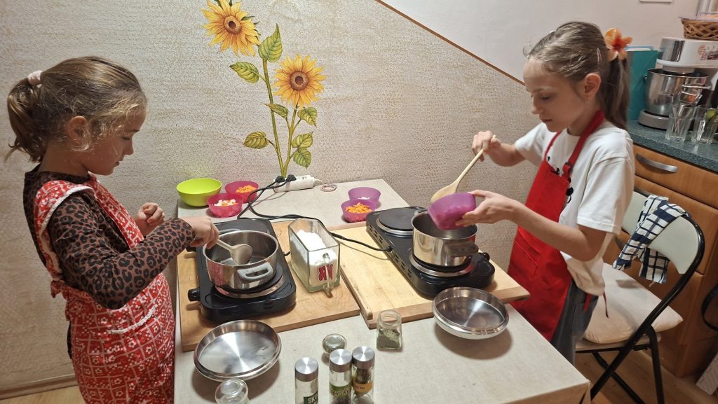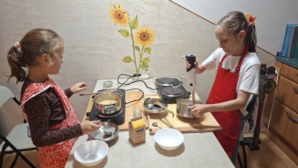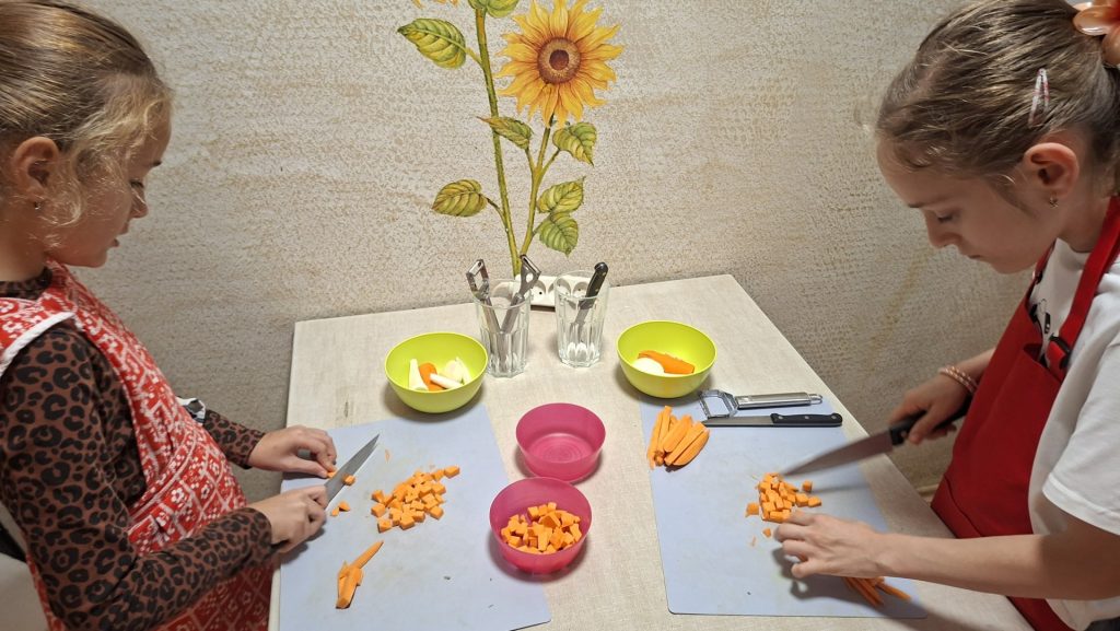 Základem je vždycky vhodný tuk, ve kterém se osmaží cibulka, což bylo pro holky zase reptání, že jim budou slzet oči. Když jsme si k tomu přidali ještě česnek, zázvor, bylo mrmlání ještě více. Ale i to se musí v kuchařském kurzíku překlenout do pohody. Důležitá byla správná příprava před samotným vařením, protože když už je jednou rozpálená plotýnka se surovinami, těžko se pak dohání zanedbaný úkon. Děti měly tedy své mističky s nakrájenou zeleninou u sebe, společně s vařečkou, pokličkou, utěrkou a dochucujícími surovinami. Ono totiž takové závěrečné doladění chutí je také docela kumšt. Ne každý to má rád více slané či pálivé. Tam už ale moje možnosti nesahají, takže jak bude polévka v závěru chutnat, záleží jen na tom, jak moc se dětem ruka s kořením usype. No a co by to bylo za krém, kdybychom do něj nedali na závěr smetanu, která hustou směs nastavila na ideální konzistenci krémové polévky.