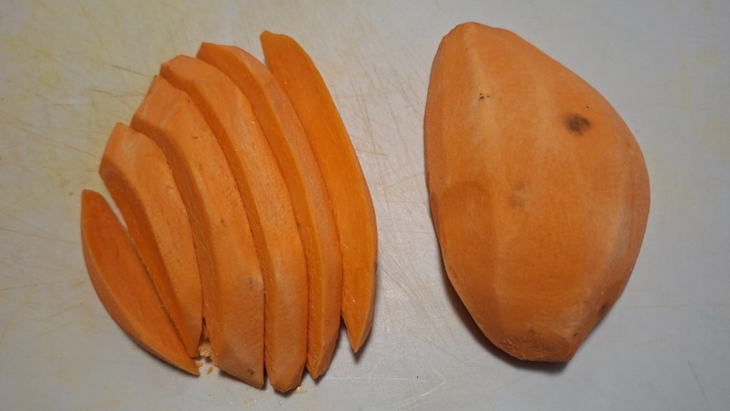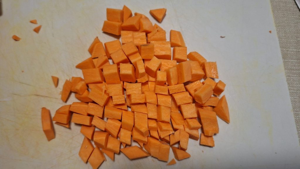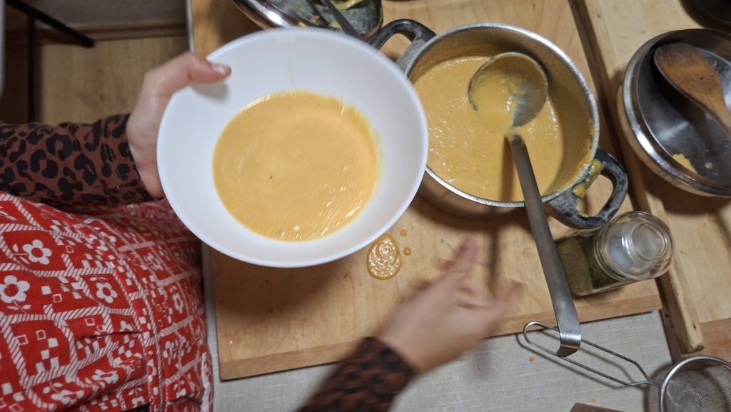 Batátový krém byla jedna velká rychlovka v komorní sestavě. Podzimní stravování vyžaduje od kuchařek trochu empatie, co se surovin a techniky vaření týká. Tělo potřebuje teploučko, což může znamenat nejen, že je polévka horká, ale že má barvu podzimu i s jeho chutí. Podle čínské medicíny náleží podzimu chuť sladká, ideálně v kašovité podobě. To potěší hlavně žaludek a jemu přísedící orgány, jako je slezina a slinivka. Tuto moudrost ví jen část dospěláků, dítěti se při získání této informace snad něco z toho do příště v hlavince usadí.